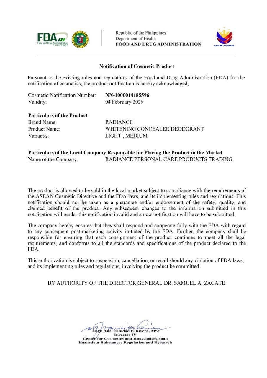 Radiance Personal Care is officially registered with the Philippines FDA (Cosmetic Notification No. NN-1000014185596)